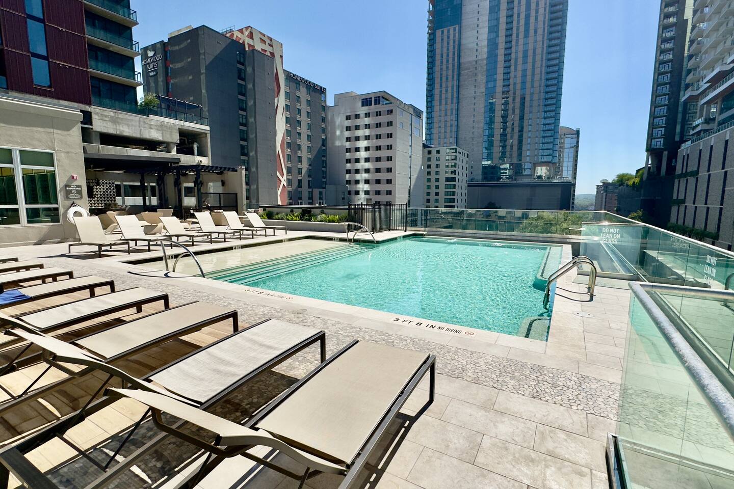 Walk to Rainey Street’s iconic bars, food trucks, and Lady Bird Lake trails from this sleek, comfy, and modern studio. Enjoy resort-style amenities including a pool, gym, and city views. Perfect for business travelers or urban explorers who want to stay steps from the best Austin has to offer.